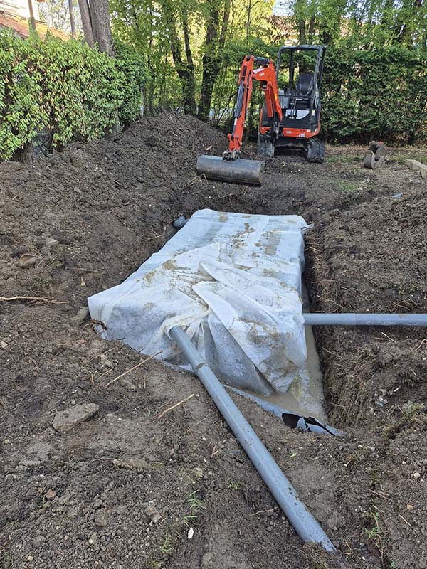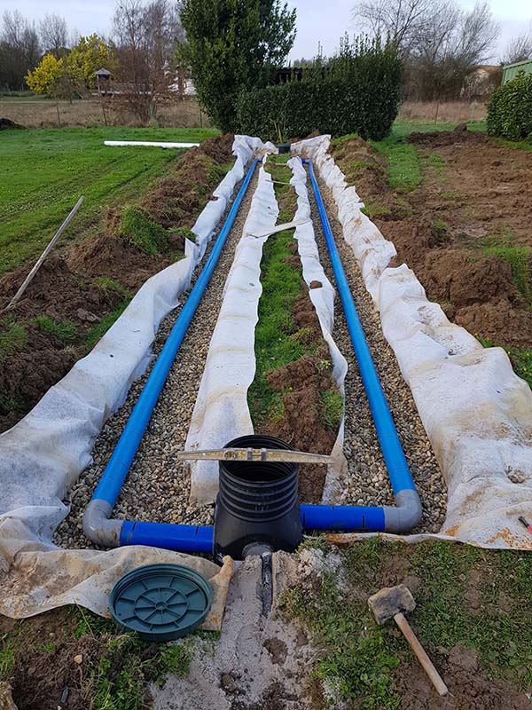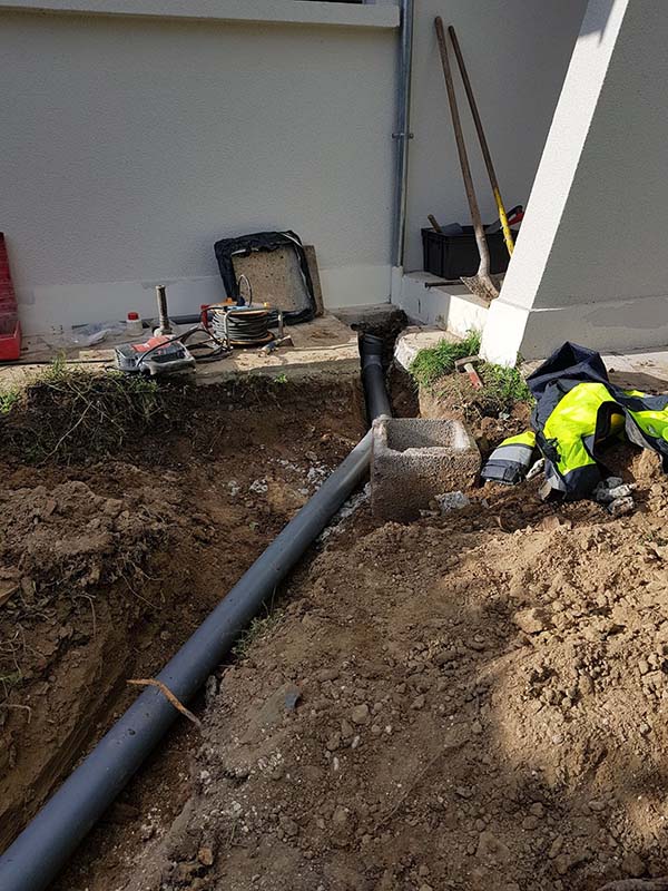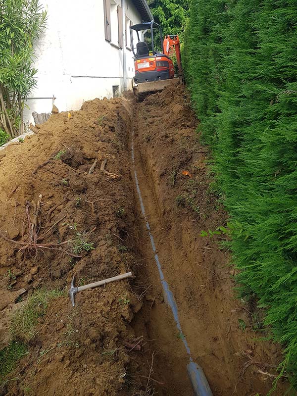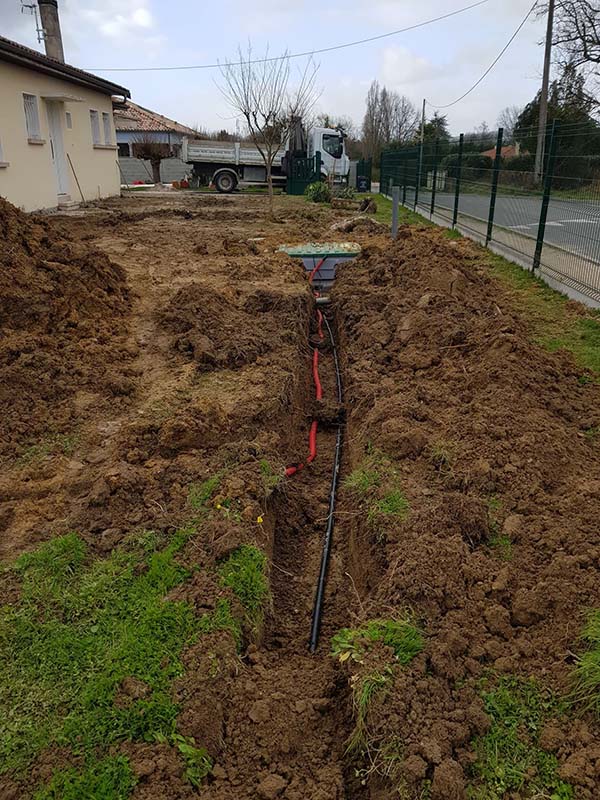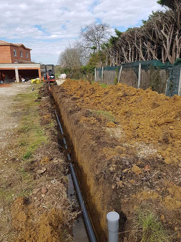 - Création de tranchées et pose de canalisations PVC adaptées.